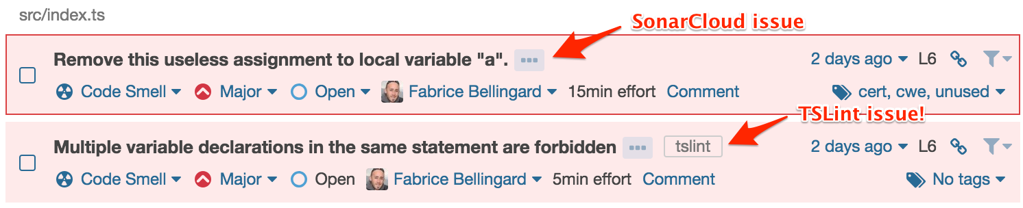 Now, when you analyze your TypeScript project with SonarQube Cloud, you can configure it to import TSLint and ESLint reports and make the issues appear as first-class citizens inside the service: