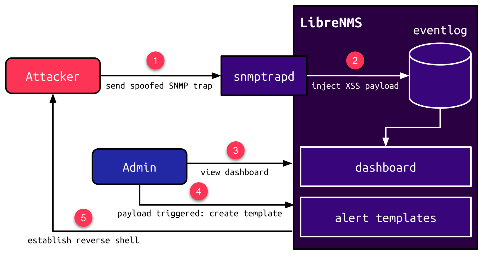 To exploit the vulnerability, the attacker sends a spoofed SNMP trap (1), which injects an XSS payload in the eventlog (2). When an admin views the eventlog dashboard via the web interface (3), the triggered JavaScript payload leverages the Alert Template feature to create a new Blade template (4), which executes arbitrary PHP code e.g., to establish a reverse shell (5):