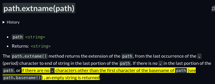 }To get the extension, the application uses the path.extname() function from Node.js. It takes a path as its argument and returns the extension. If we look at the function's documentation, we can see the following:
