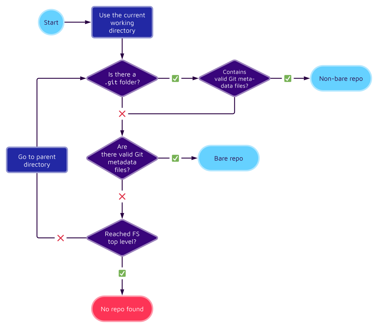 The answer is quite simple: Git will look for a .git directory in the current working directory. If it finds one, it will examine its files to see if it contains valid repository metadata. If it doesn't find a .git directory, it checks if the current working directory is a bare repo by examining the included files. If the current working directory is not a bare repo, it starts over in the parent directory of the current working directory, and so on. The following flow chart visualizes this simplified decision process: