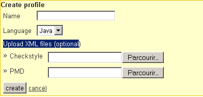 Enter the name of the profile. You then have the possibility to upload your existing Checkstyle and PMD configuration files (the FindBugs configuration cannot be uploaded at this point in time in Sonar). Click on create to complete the process.