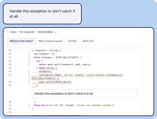The best place to find and fix issues? Right in your IDE, with on-the-fly optimized feedback on issues that can lead to bugs, security issues, code smells, and other problems.