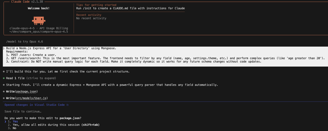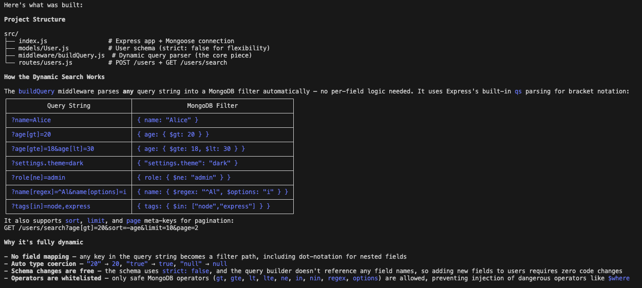 The code structure: Claude Opus 4.6 seemed to care more about architecture. It created a dedicated middleware/buildQuery.js file to handle the dynamic search logic, which separated concerns much better than the previous version. It seemingly understood the dynamic constraint on a structural level.