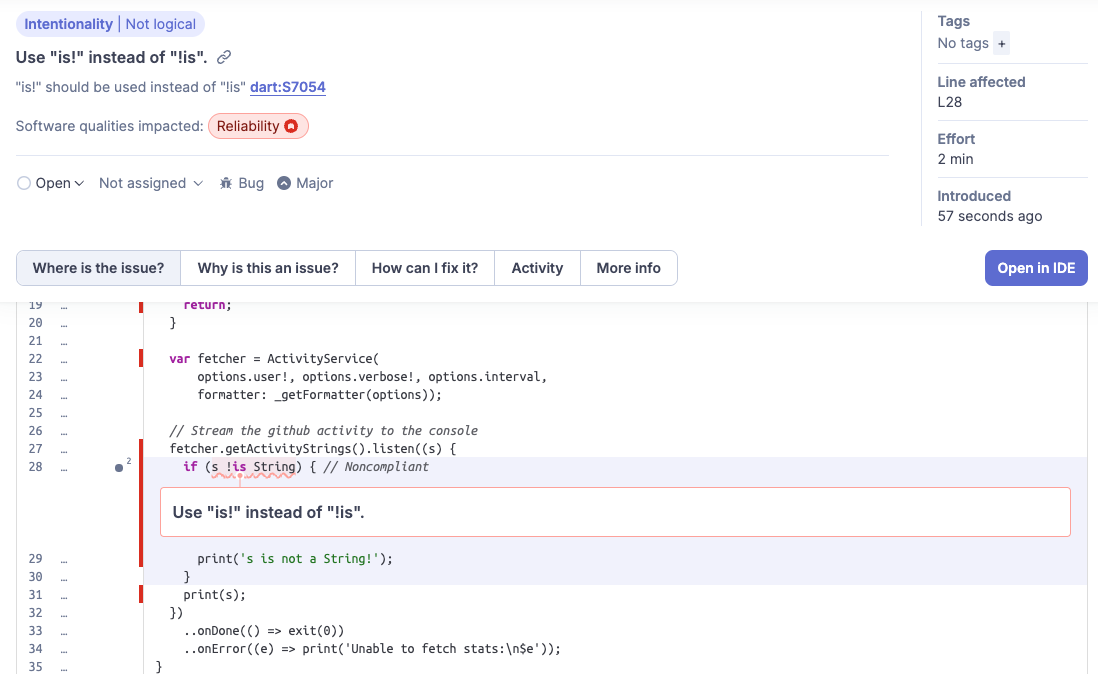 In addition, we also created our own unique rules, which currently make up around 10% of the total number of rules. See this example and screenshot below. We will continue to build upon these unique Sonar rules for Dart in the coming months.