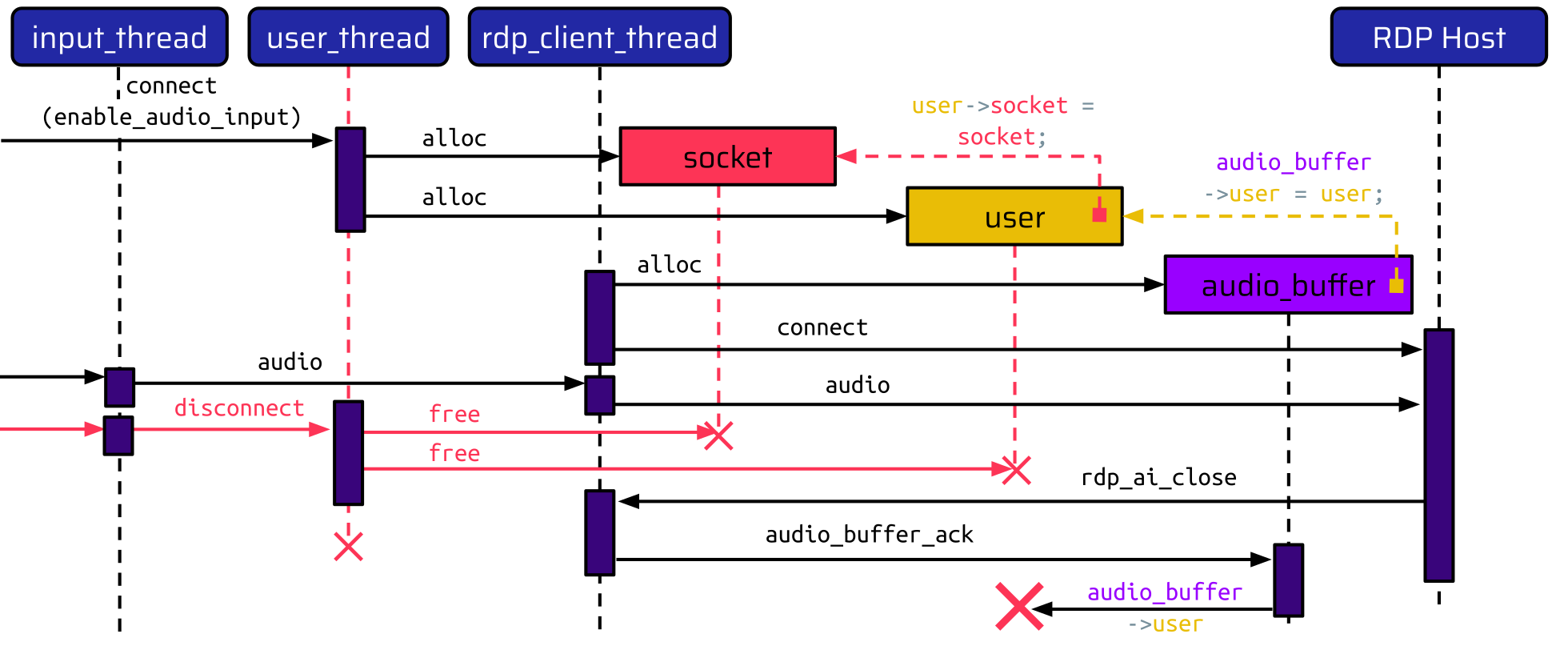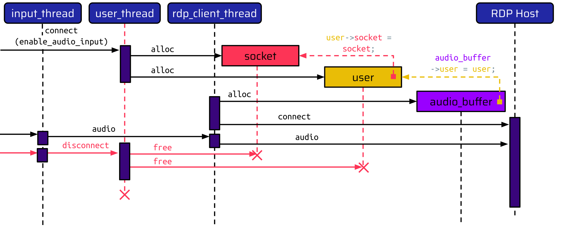 The user_thread handles the initial connect instruction and allocates two data structures: one for the socket and one for the user. The user holds a pointer to the socket allocated before. After this, the RPD connection can be initiated using the rdp_client_thread. When enable_audio_input is set to true, this thread allocates an additional audio buffer, which holds a pointer to the user. Thus, there is a pointer chain from the audio buffer - to the user - to the socket.