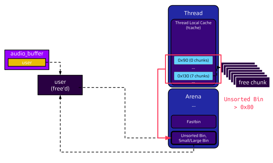 Let’s have a closer look at what exactly is happening when the user is put into the unsorted bin instead of a tcache bin.