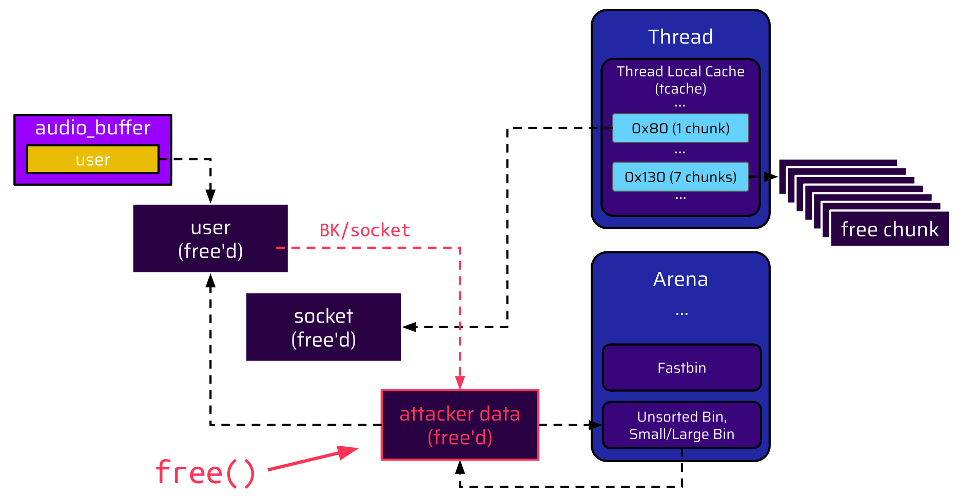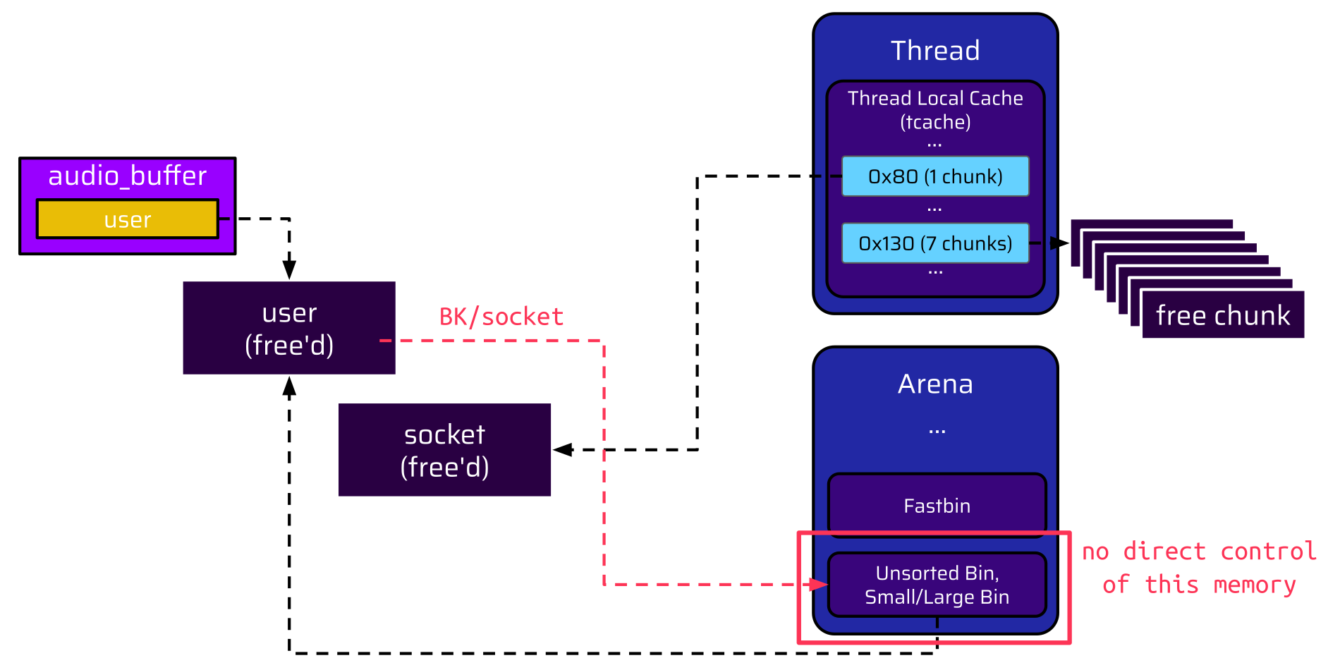Again, before the user is freed, it holds a pointer to the socket at offset 8, as shown in the below image. Once the user is freed, it is put into the unsorted bin. Because this bin is doubly linked, a backward pointer (BK) is inserted at offset 8. This, again, overwrites the socket pointer, but now the socket pointer is a valid pointer, which references the unsorted bin in the arena: