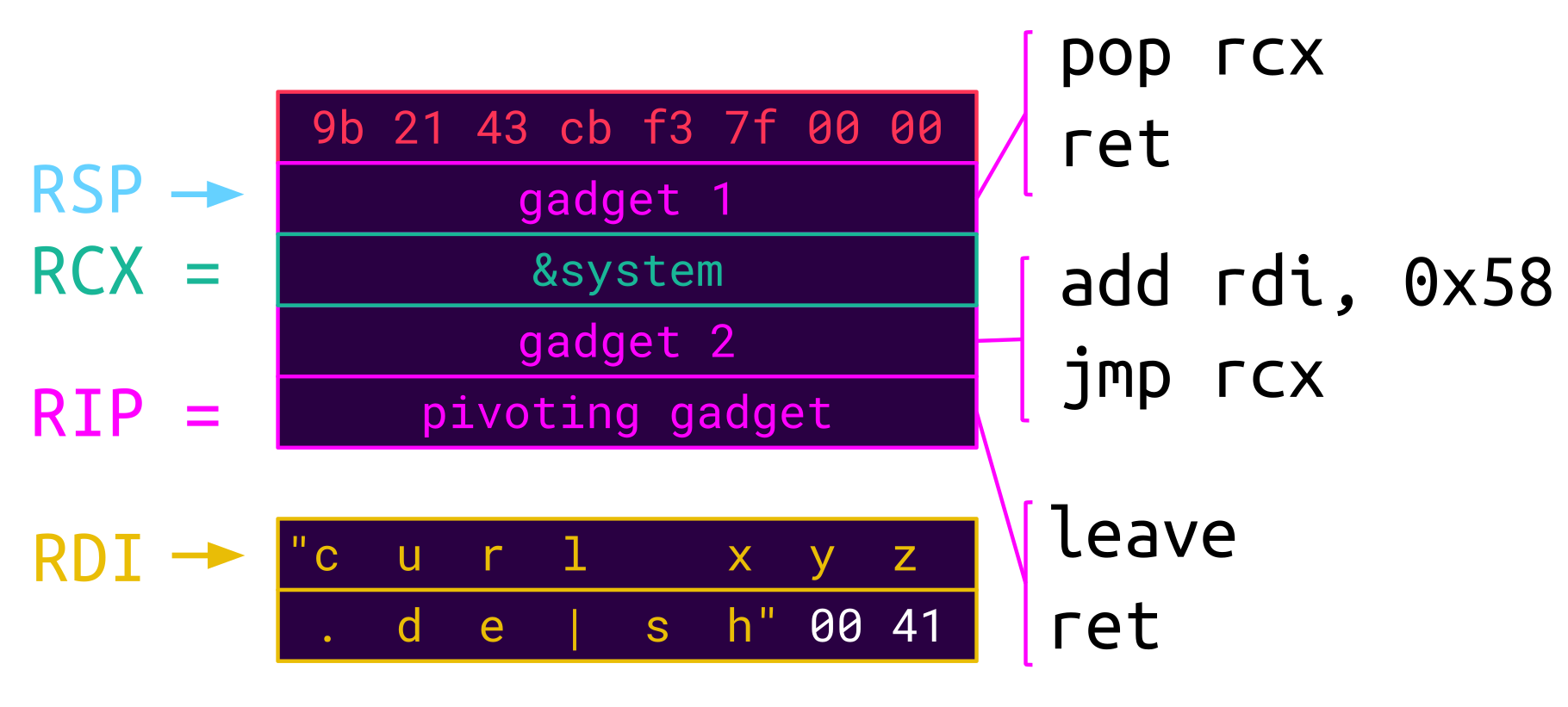 The first gadget loads the address of system to RCX, and the second gadget offsets RDI to the command string to be executed and jumps to system. Thus system is executed with the command string provided as its first argument.