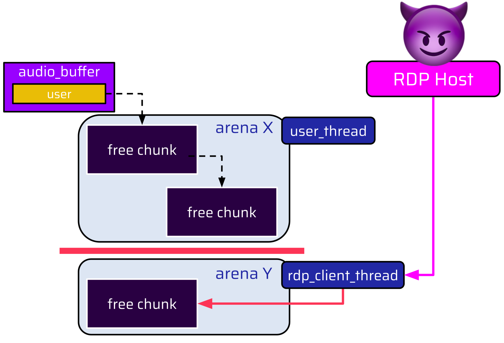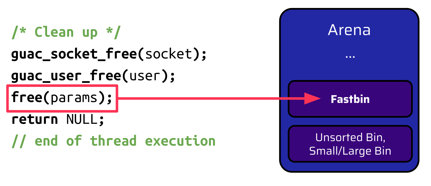 It would be possible to do an allocation from the RDP connection, which is handled by the rdp_client_thread and is still alive, but since this is another thread, it is also attached to a different arena. Every allocation an attacker could make via the rdp_client_thread is served from this arena (arena Y):