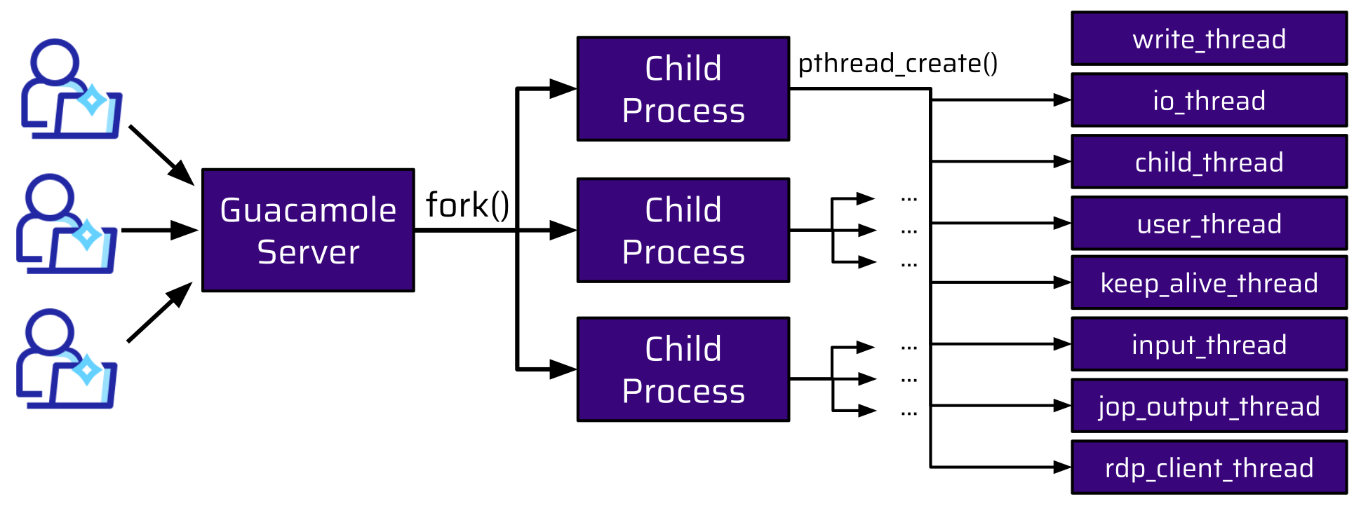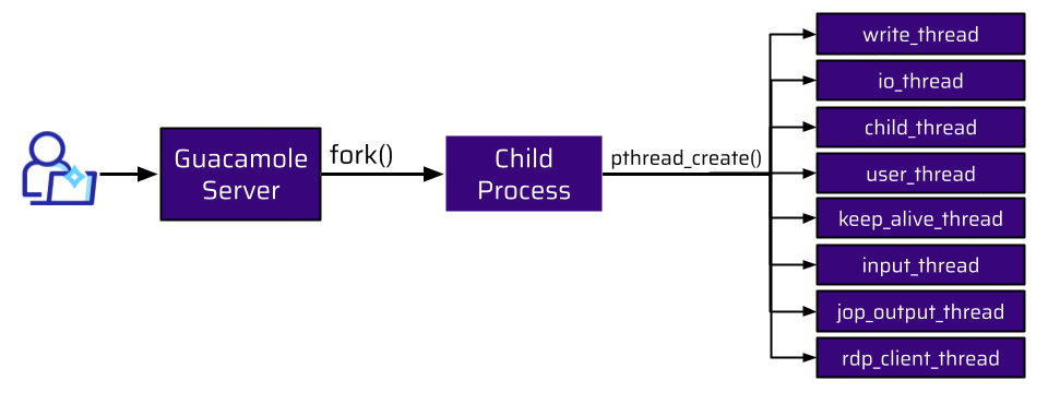 So, how many workers does Guacamole employ? When a user connects to the Guacamole Server, the main process forks a new child process. When another user connects, a new child process is forked. This is done for every new connection: