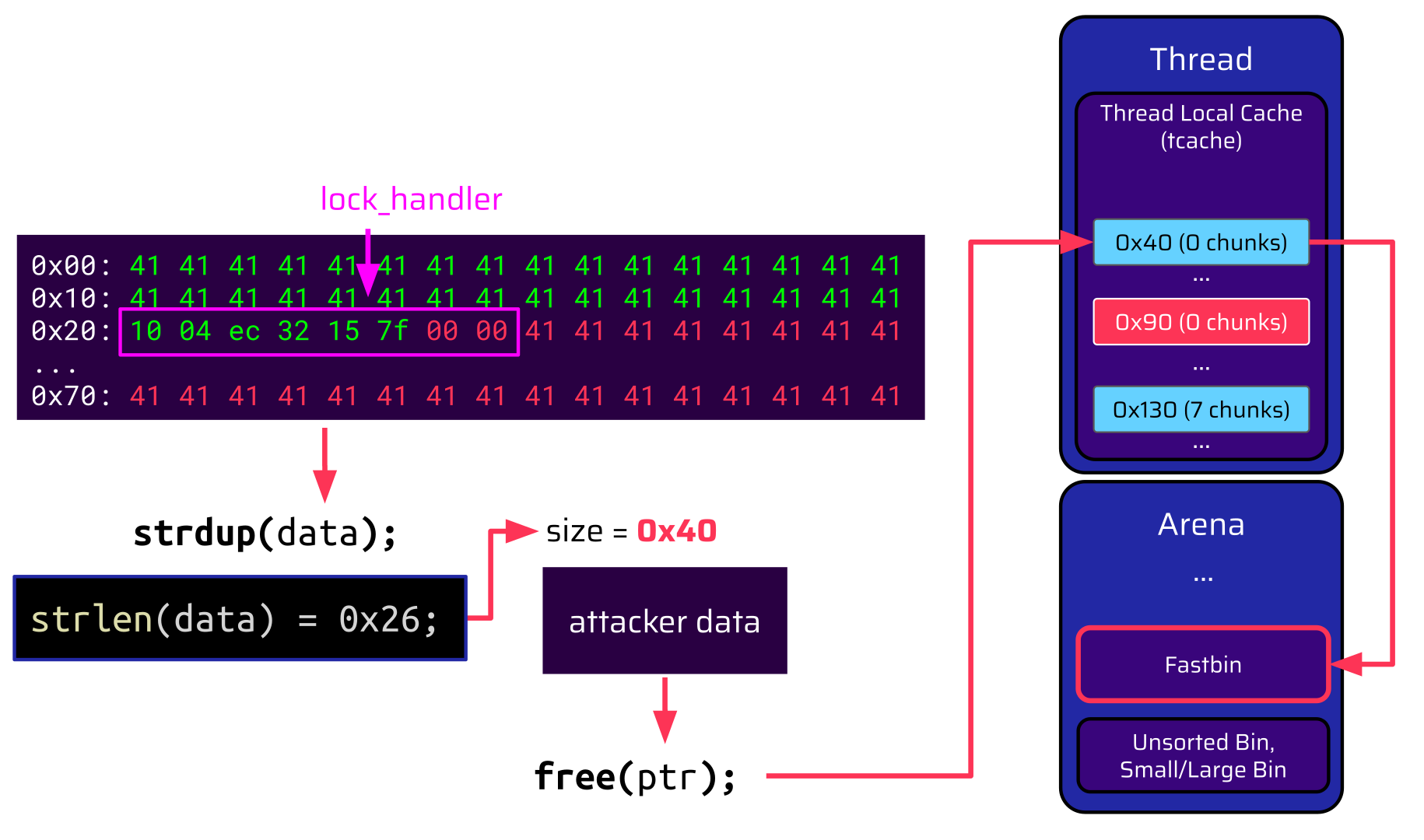 If the attacker wants to populate the lock_handler function pointer with a gadget address, this address contains null bytes. strdup will only copy the data until the first null byte. This on its own is not a problem because the attacker only has a one-shot gadget anyway, but the size of the allocated chunk is now far less. That means if the chunk is freed, it is put into the 0x40 tcache bin instead of the 0x90 tcache bin. When the thread terminates, this tcache bin is not transferred to the unsorted bin but to the fastbin.
