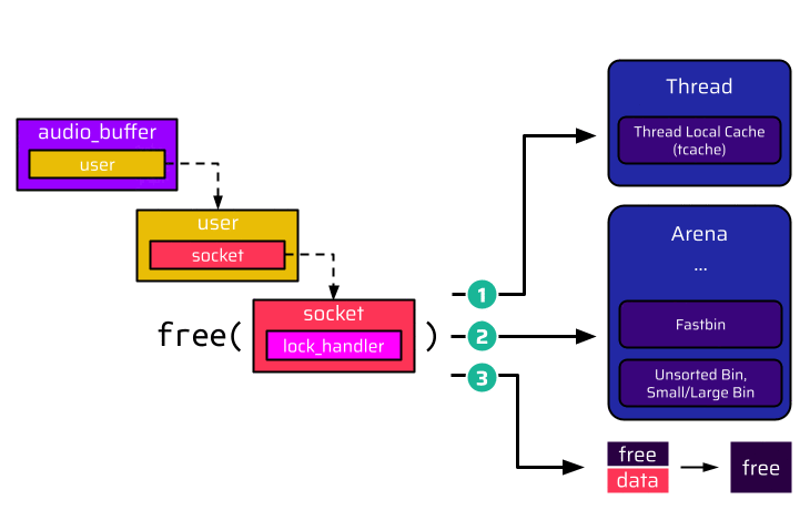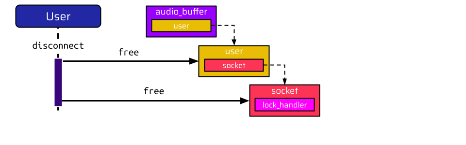 Once the user disconnects, the user and socket are freed. At this point, there are actually two dangling pointers: The first one is the user pointer in the audio buffer, and the second one is the socket pointer of the already freed user. The most straightforward approach is to reallocate the freed socket and populate the lock_handler function pointer with some address the attacker wants to call: