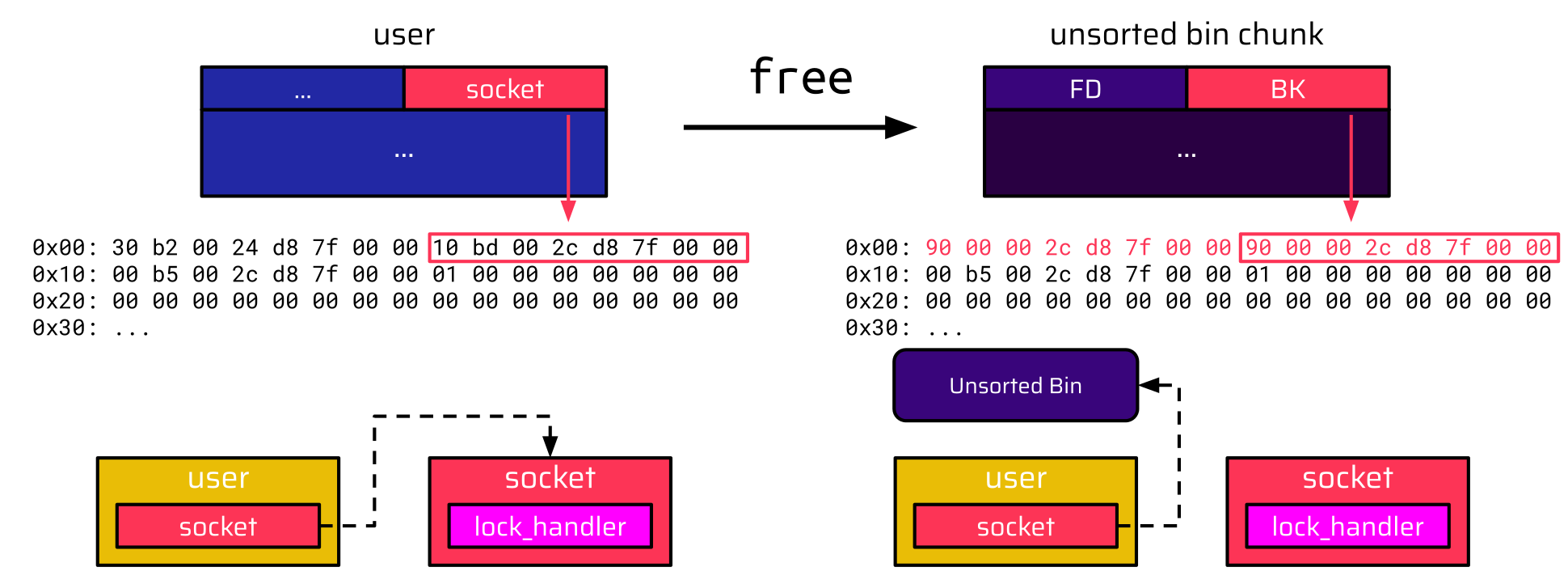 Since this chunk is added to the unsorted bin right after the freed user structure, the backward pointer (BK), which overlaps with the socket pointer, now references this chunk with the attacker data. Therefore, the attacker created a valid data structure: