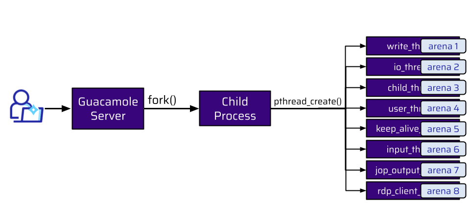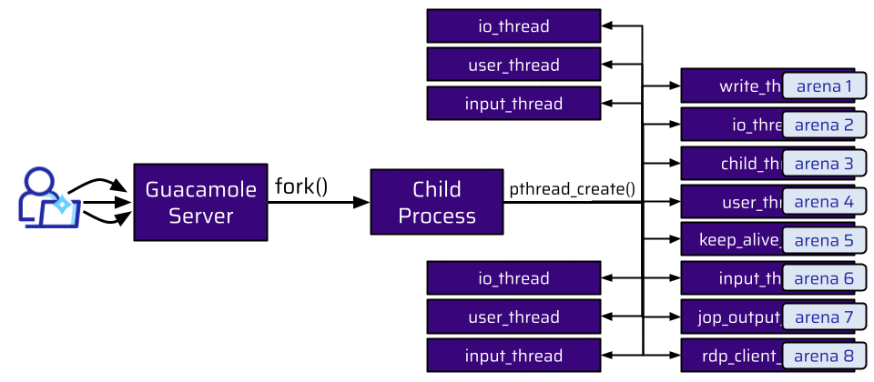 We have a lot of threads. All of these threads are assigned to a different arena. When the connection is terminated, the user and socket are freed by the user_thread and returned to the arena this thread is attached to (arena 4). An attacker could still make allocations, but only from the rdp_client_thread, which is attached to a different arena (arena 8):