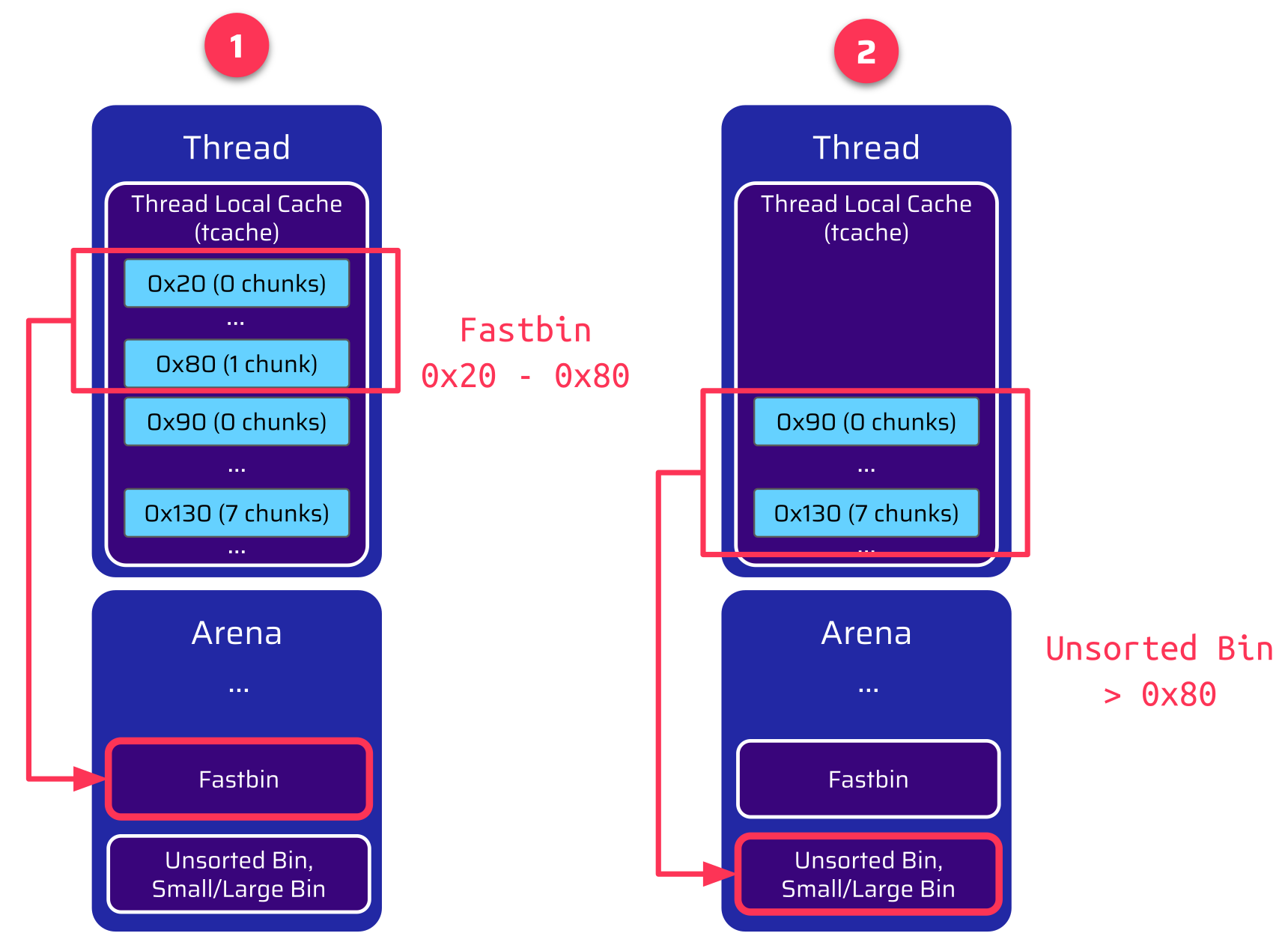 And here is the window of opportunity for an attacker. The first tcache bin suitable for the unsorted bin is the size 0x90 tcache bin. When the thread is terminated, this bin is empty by default. If an attacker had made the application allocate and free a chunk of size 0x90 beforehand, it would have been placed into this tcache bin. This is now the first chunk, which is transferred to the unsorted bin during the thread shutdown.