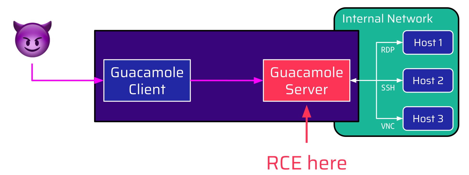 At this point, the attacker has gained code execution on the Guacamole Server via the externally exposed Guacamole Client:
