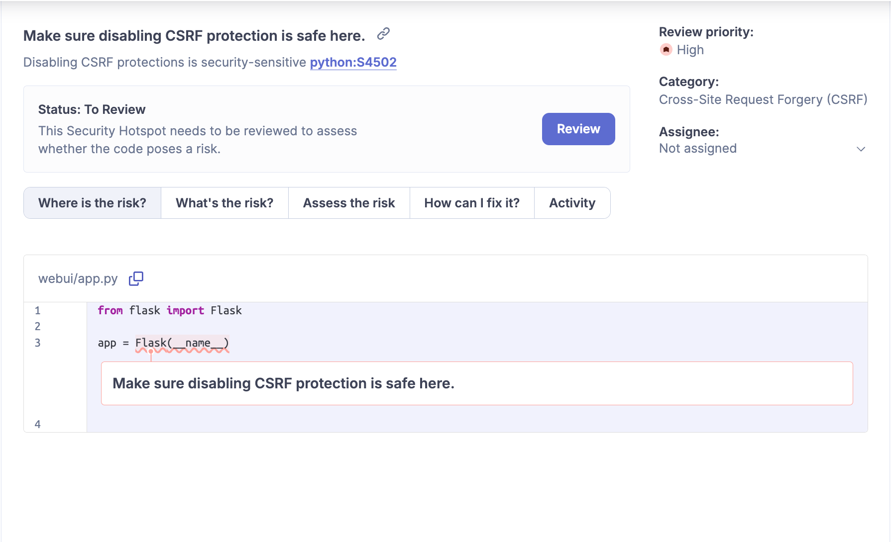 The second finding is a security hotspot warning us that there is a risk of Cross-Site Request Forgery (CSRF) when using Flask without any protection.