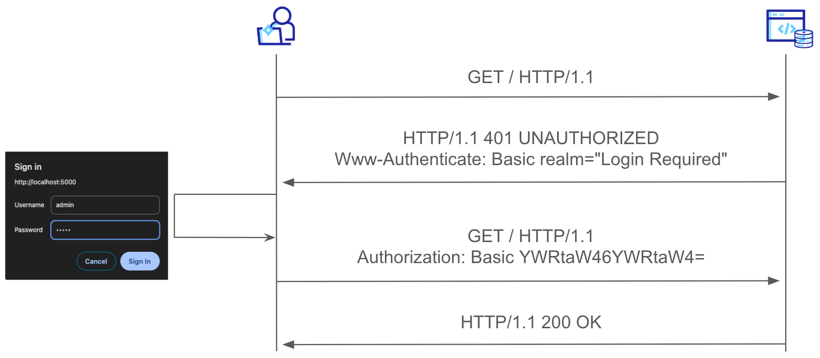 This authentication method is used under the hood is Basic HTTP authentication. While this is a rather legacy authentication mechanism it is still supported by modern browsers. On top of that they handle it conveniently, by using the built-in UI prompt and sending the credentials in the subsequent requests via the Authorization header: