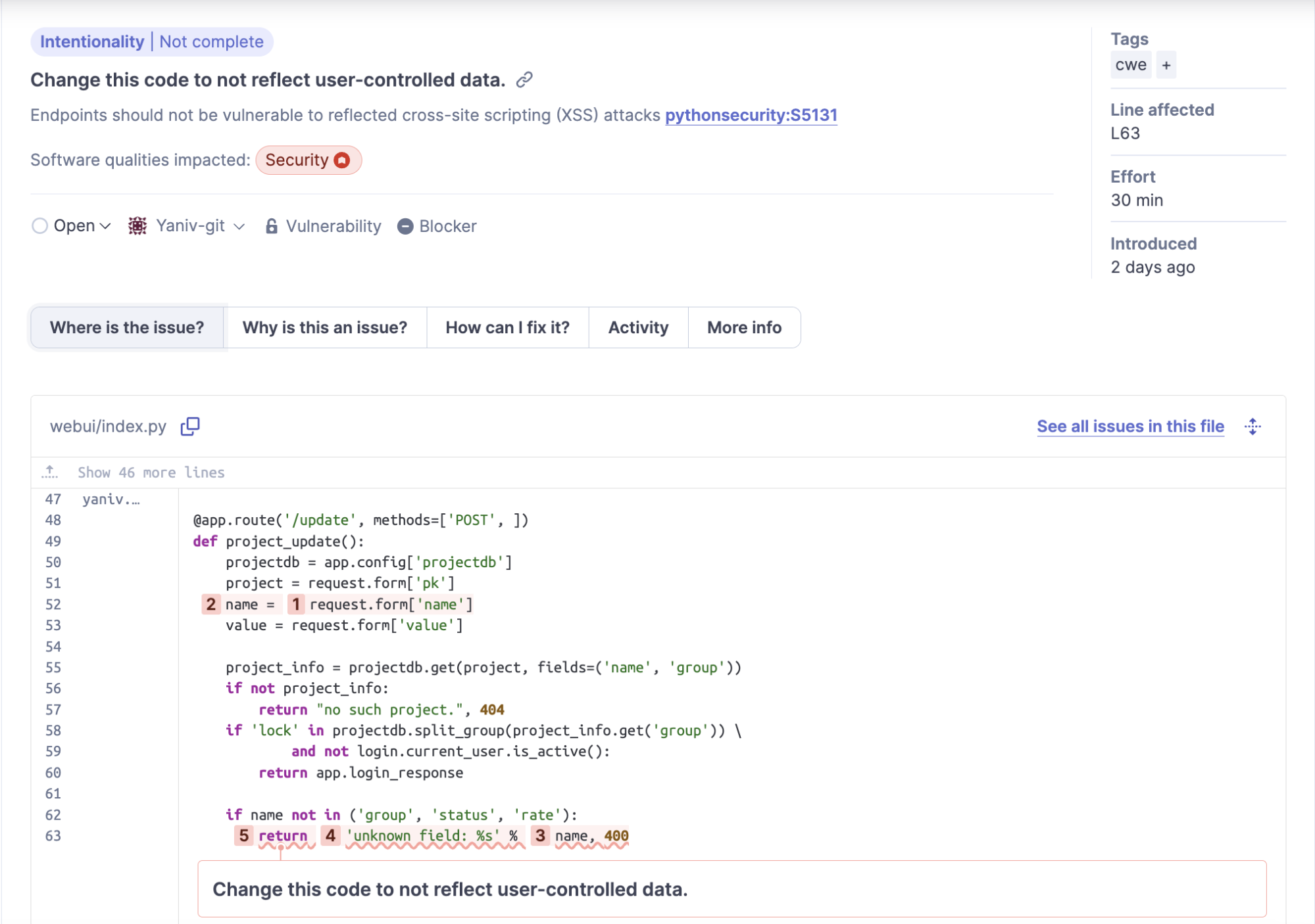 The second detected vulnerability reported by SonarQube Cloud is an XSS in the /update endpoint.