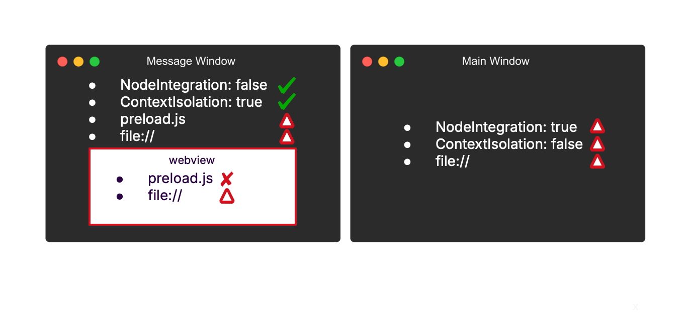},These settings, particularly contextIsolation and disabled nodeIntegration, are intended to enhance security by isolating the window's context. For plaintext messages, the content is directly injected as text using the textContent property, preventing any HTML rendering. However, HTML messages are saved locally, in the file:///tmp/fct_endpoint_message.html file, and rendered within a webview.
