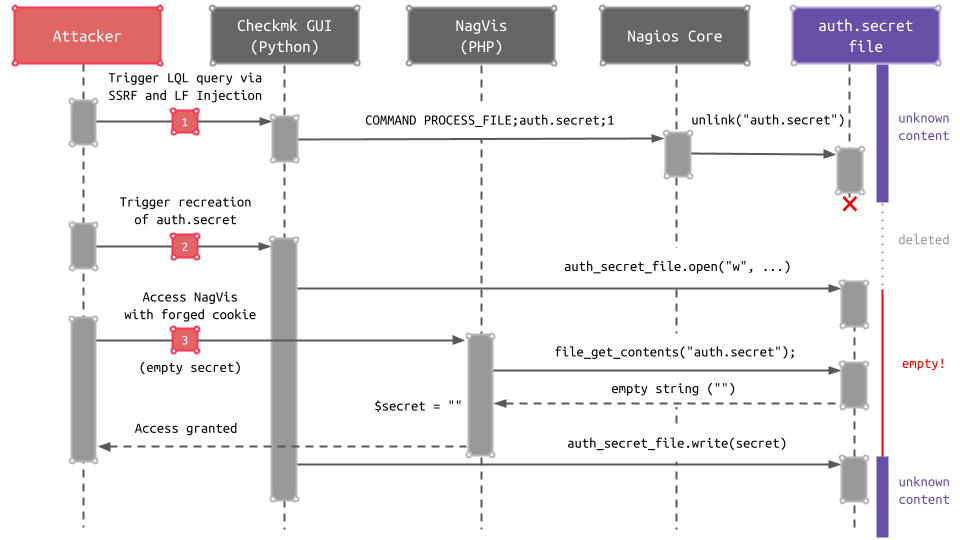 (1) At first, an attacker can leverage the SSRF and LF Injection vulnerabilities to trigger an LQL query with the PROCESS_FILE command to delete the auth.secret file. After this, the attacker can quickly trigger two requests: (2) one request to the Checkmk GUI to recreate the auth.secret file and (3) another request to NagVis with a forged cookie assuming an empty $secret value. If the resulting file_get_contents call in NagVis is executed at the right time, the $secret value is empty, and access to NagVis is granted. If the attempt fails, the process can simply be repeated.