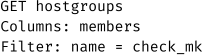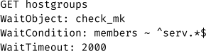 A more efficient way to determine the name of monitored hosts is to use the hostgroups table. By default, each host is added to the default host group check_mk. This is the name of the hostgroups object within this table and can thus be used for the WaitObject header. The table contains a column called members, which contains all hostnames within this host group. For example, a request to this table may look like this: