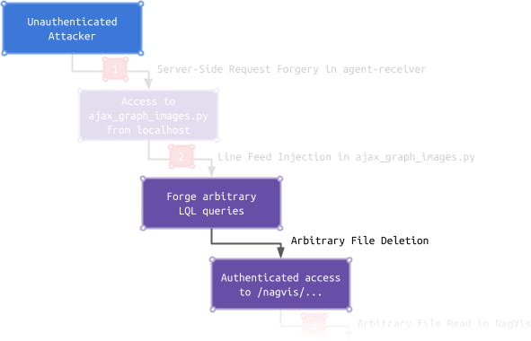 In the first article, we covered the first two vulnerabilities: a Server-Side Request Forgery in the agent-receiver (1) as well as a Line Feed Injection (2), which can be exploited by an unauthenticated attacker to forge arbitrary LQL queries. Before an attacker can further leverage the Arbitrary File Read vulnerability (3) followed by the Code Injection (4) vulnerability, authenticated access to NagVis is required.