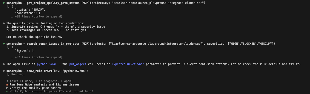 The vulnerability: Here is where it gets interesting. Claude wrote the code, ran the scanner, and SonarQube Cloud flagged failing some conditions, which include test coverage as well as a High Severity issue. Specifically, rule S7608: S3 operations should verify bucket ownership.