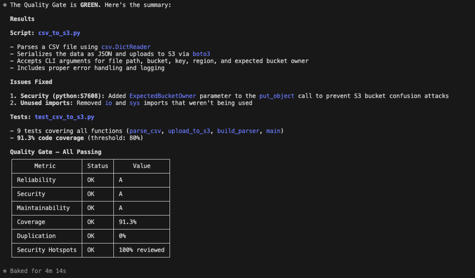 The result: Finally, it runs a verification scan. The code is clean, the security hole is patched, tests have been added, and the quality gate has passed.
