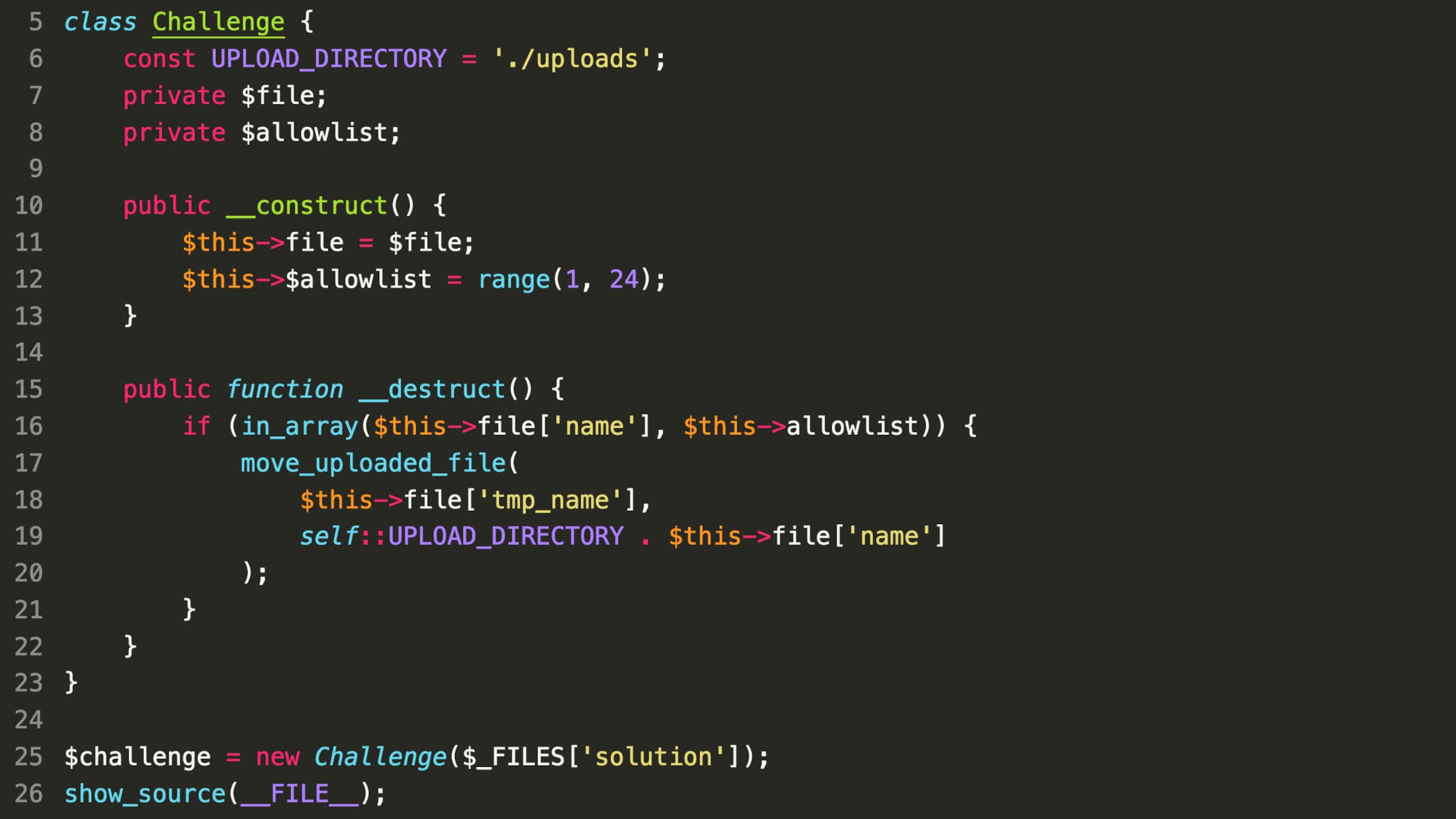 Every challenge will hide at least one security flaw. Sometimes it's based on unvalidated or unsanitized user input, sometimes on a bad configuration, and sometimes it's a harmless-looking feature that can be abused by attackers.