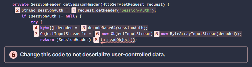 The code snippet below shows a Deserialization vulnerability. The code fetches data from the Session-Auth HTTP header [1] and then tries to invoke Java objects based on this data [6-8]. Since any HTTP header can be manipulated by an attacker, the Java objects can be malformed which enables an attacker to gain remote code execution.