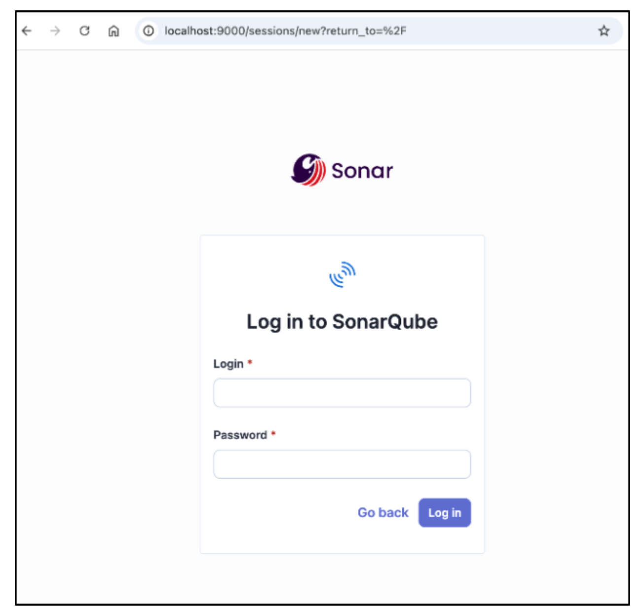 $ kubectl port-forward <NAME OF POD> 9000:9000 -n sonarqubeOpen a browser and navigate to http://localhost:9000. You should be greeted with the SonarQube login: