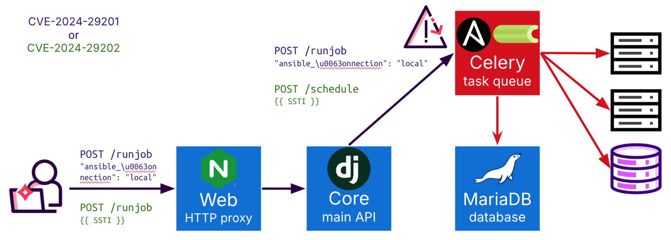 This feature uses Ansible's Jinja2 templating which has full Python code capabilities. Rendering user-controlled templates is considered unsafe and is called Server-Side Template Injection. An attacker can simply execute Python code where the template is rendered, which is the Celery container.