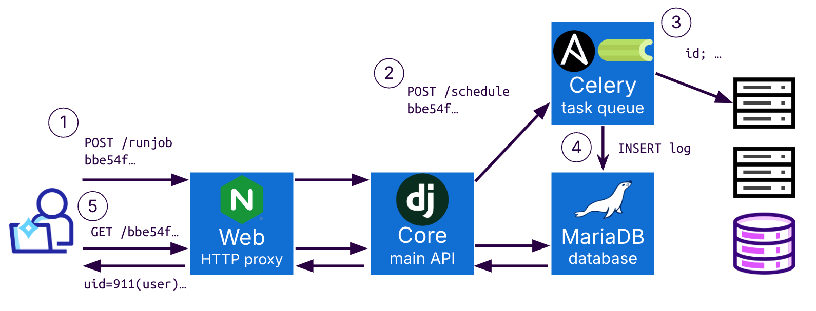 The user requests to execute a task using the HTTP API, which is then forwarded by the core API to the Celery service. Upon availability, Ansible executes the task and receives the output from the internal host. After receiving the results, Celery uploads it to the database, allowing it to be visible to the user via a different API call.