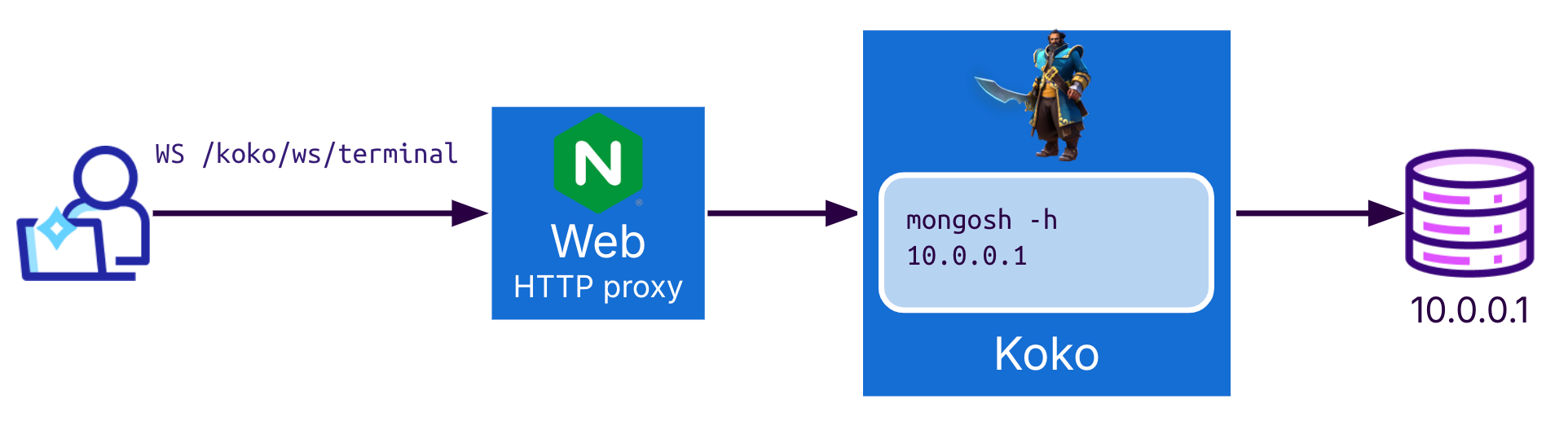The MongoDB connection is enabled by making the user communicate with the web proxy using a web socket, which is then handled by Koko using a new mongosh subprocess that connects to the database itself
