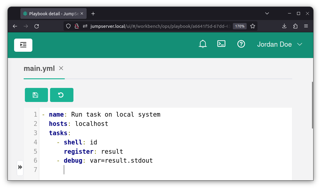Trying to execute local tasks using the built-in features within the playbook file, as shown in the official documentation, will trigger an exception in JumpServer: