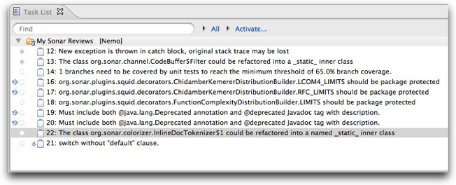 If you're using Eclipse, you are lucky: Sonar Eclipse provides a very efficient way to work with reviews. Thanks to its Mylyn connector, Sonar Eclipse brings all the reviews assigned to you right inside your task view in Eclipse. There too, in a second, you see all the reviews that you have to work on. Open a review, click on a link to open the corresponding file, fix the defect and resolve the review to "fixed" so that it doesn't show up in your task list any longer: this is that simple to fix a violation! And if it turns out that the fix is not obvious, you can start a thread of discussion on that review by adding a comment.