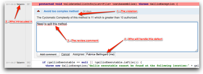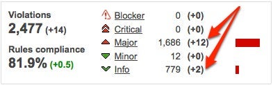 To track the newly introduced violations, use the differential violations drilldown. For every newly introduced violation - there shouldn't be too many as you become more and more familiar with quality rules, create a review and assign it (or - when appropriate, flag it as false positive). If your source configuration management tool is supported by Sonar, finding the developer who introduced the violation is even simpler as his identifier appears next to the violation (as long as you installed Sonar SCM Activity plugin).