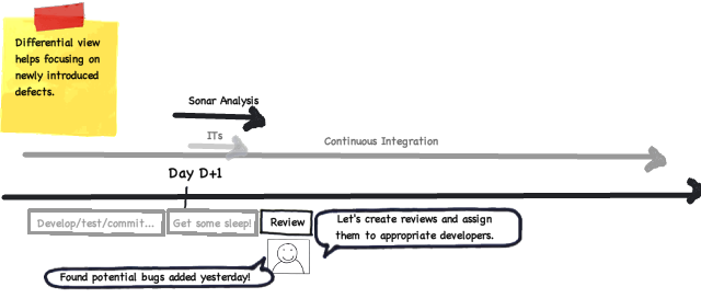After a good sleep and a cup of coffee, the first thing you want to know is how well you coded the previous day : log into Sonar and activate the "since previous analysis" differential views on your project: in a second, you see if new defects have been introduced. Those may identify - for instance - potential bugs, too complex classes or insufficiently tested methods. But whatever those violations are, you know that they increase the technical debt of your application. Fixing a violation is like fixing a bug: the sooner, the cheaper - as the context of the violation is fresh in your mind.