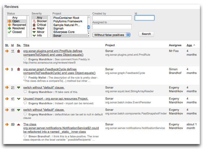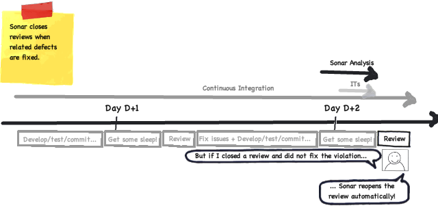 Sonar handles code quality for you, but it also makes sure that fixed reviews have correctly been handled. During the next analysis, for each fixed review, if its corresponding violation has actually disappeared, Sonar will set the review to "closed". If not, Sonar will reopen the review: in the morning, you will then see it again in your task list (or receive a mail) with the "reopened" status.