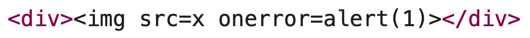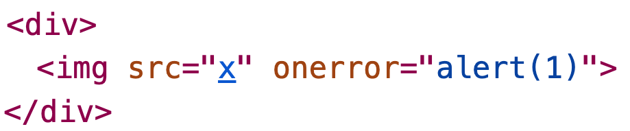 If userInput contains <img src=x onerror=alert(1)> now, it is actually inserted as raw HTML and the alert box is triggered. The syntax highlighting in the DOM tree now looks like this: