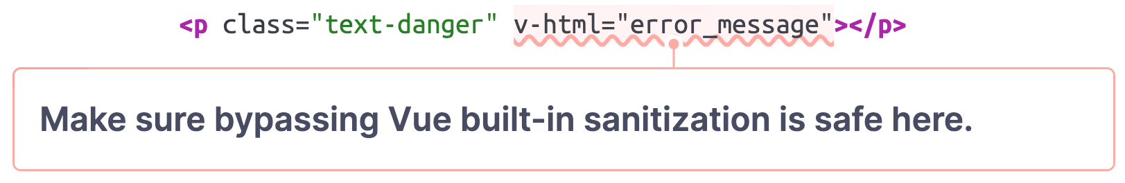 This deliberate bypass of the built-in sanitization should be used with caution and only in scenarios where it can be ensured that a user cannot control the value that is inserted as raw HTML. This does not only apply to Vue.js, but also to other JavaScript front-end frameworks.