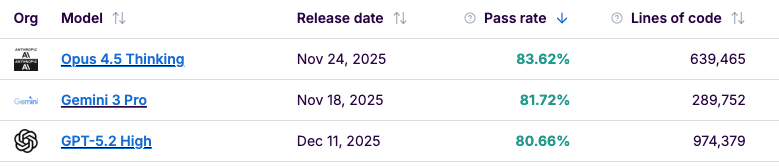 • Gemini 3 Pro: Solves the problem set with ~289k lines of code.