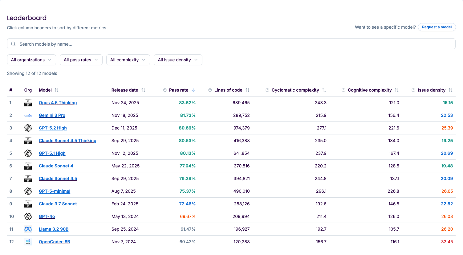 The leaderboard tracks issue density to quantify this risk. Models like Opus 4.5 Thinking have a very low density (15.15), while others like Llama 3.2, GPT 5 and 4o can go over 26 issues/kLOC. But the consequential part is not the quantity, it is the criticality.