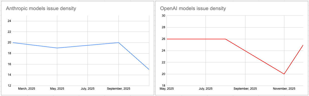 • GPT-5-minimal (Aug '25): Issue density of 26.65.