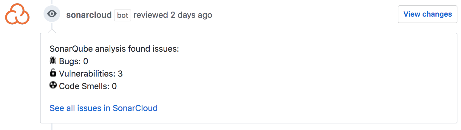 To make things easier, we have now published the first version of the SonarQube Cloud GitHub application which currently does only one thing: it removes the need to configure a GitHub token on your project to activate the PR decoration. You just need to install the application on your organizations (by hitting https://github.com/apps/sonarcloud), get rid of the user token you might have set on your projects, and that's all. Comments on your PR will then be authored by SonarQube Cloud itself!