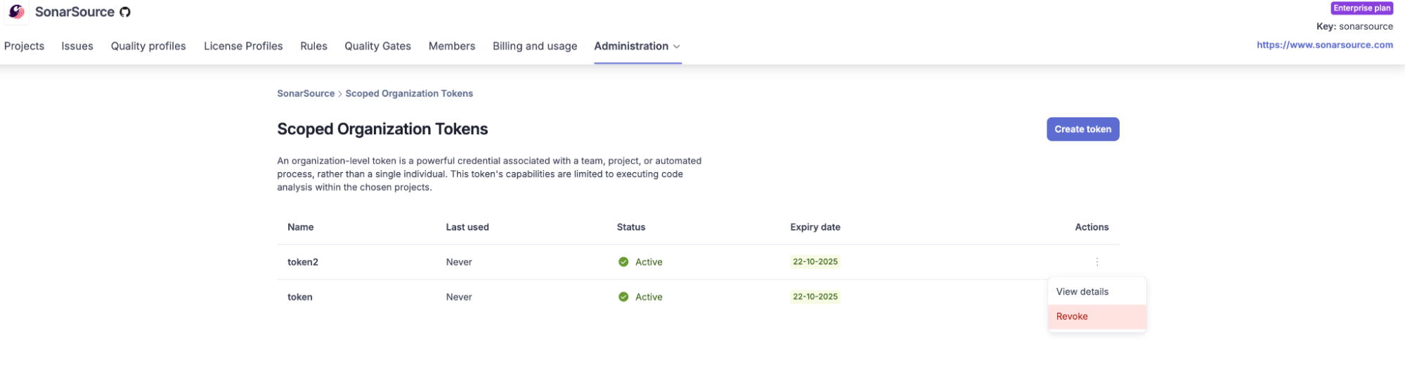 You can view and manage all of your SOTs from the same screen, making it easy for administrators to see the list of tokens within their organization and their scope, when it was last used, and when it expires. They are also empowered to revoke a token at any time.