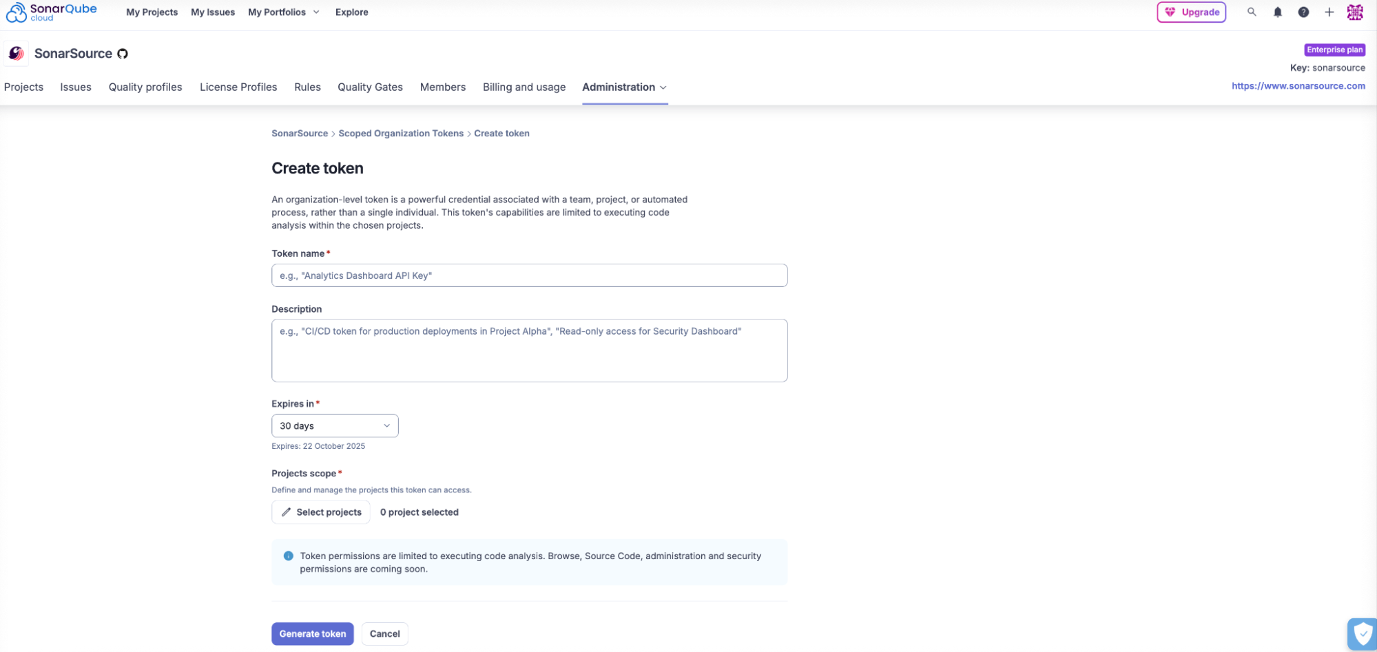 • Simplified and Centralized Management: SOTs provide a single, centralized place to manage and revoke tokens. Administrators can get a clear overview of all tokens in use, their specific permissions, and their expiration dates. You can create these tokens directly within your SonarQube Cloud organization.